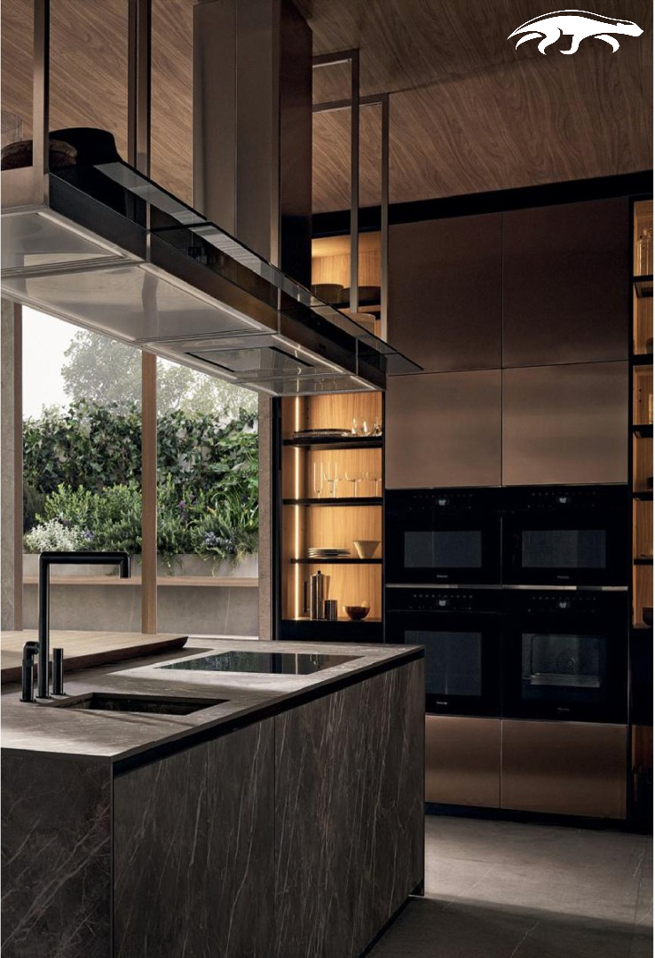 Tủ bếp nổi bật với sự kết hợp tinh tế giữa các vật liệu thượng hạng: đảo bếp và mặt bếp được ốp đá marble xám với những đường vân tự nhiên mạnh mẽ, trong khi hệ tủ cao sát trần phía sau sử dụng lớp hoàn thiện bằng kim loại hoặc laminate màu đồng ấm áp.
